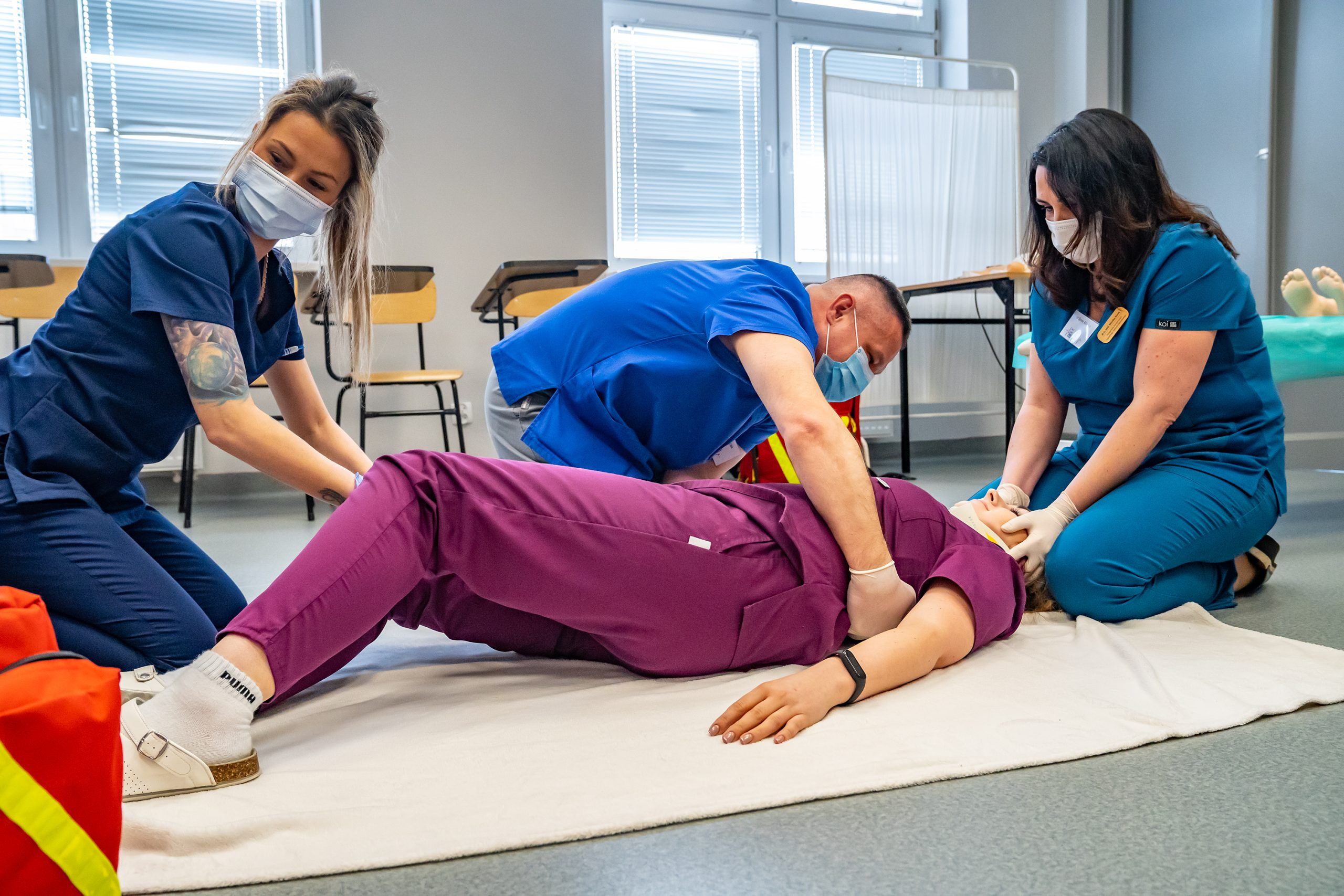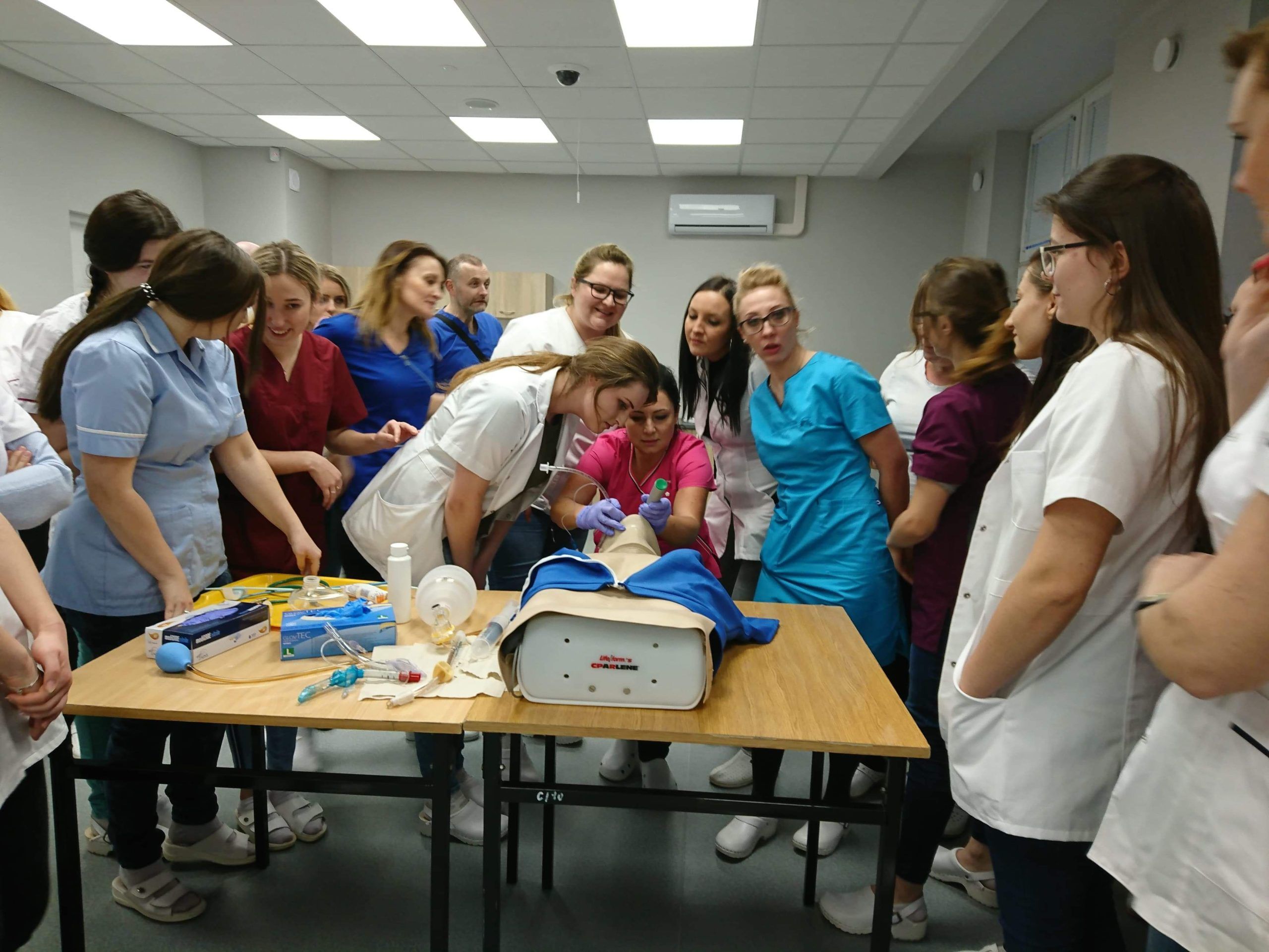 To nowoczesna baza dydaktyczna przeznaczona dla studentów kierunku pielęgniarstwo, dzięki której realizują oni ćwiczenia i zajęcia praktyczne przy pomocy zaawansowanych symulatorów wysokiej wierności, fantomów najnowszej generacji oraz nowoczesnych trenażerów. Kształcenie w tej formule oparte jest na szeroko pojętej symulacji zdarzeń medycznych, która dzięki zastosowaniu realnych scenariuszy pozwala na zdobycie praktycznych umiejętności, unikając przy tym niepotrzebnego ryzyka dla pacjenta. Zajęcia w Centrum Symulacji realizowane są już od listopada 2018 roku. Dysponujemy 7 salami dydaktycznymi: 2 sale niskiej wierności kształcą w podstawowych umiejętnościach pielęgniarskich, 2 sale służą do ćwiczeń w czynnościach ratowniczych i wykonywania resuscytacji krążeniowo- oddechowej. Kolejna, nasza perełka – to sala wysokiej wierności wyposażona w symulatory wysokiej wierności oraz sprzęt symulujący warunki panujące w OIOM w szpitalu czy klinice. Studenci mogą również korzystać z sali do debrefingu, gdzie na olbrzymim ekranie monitora śledzą własne poczynania w trakcie realizacji scenariuszy zajęć nagranych w postaci filmu, dzięki bogatemu systemowi audiowizualnemu w jaki wyposażone jest centrum. Ukoronowaniem wysiłków jest złożenie przez studentów Obiektywnego Egzaminu Klinicznego w specjalnie to tego przeznaczonej sali, który jednocześnie kończy zajęcia w centrum symulacji.